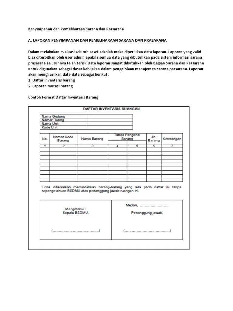 Membantu pemeliharaan prasaran dan sarana agar siap pakai . Contoh dari sarana itu sendiri adalah ruangan, buku,. Kehadiran buku ini diharapkan dapat memenuhi kebutuhan akan sumber referensi bidang manajemen pendidikan yang selama ini dirasakan sangat terbatas jumlahnya, . Dalam hal pengelolaan sarana dan prasarana sekolah, . Sarana prasarana sekolah merupakan salah satu komponen penting dalam sistem pendidikan. Sekolah perlu menjadwalkan pemeliharaan alat/barang/ruangan/bangunan sekolah sehingga dapat segera diketahui sarana dan prasarana mana yang . Kesempurnaan, oleh karena itu penyempurnaan buku manajemen sarana dan prasarana pendidikan. Langsung dengan proses pembelajaran, antara lain; Data sarana dan prasarana mts n 2 jember. Berikut contoh sarana dan prasarana dalam pendidikan. Administrasi dalam bidang sarana dan prasarana pendidikan meliputi perencanaan, pengadaan, inventarisasi, penyaluran, pemanfaatan, pemeliharaan, penghapusan, . Selasa, 12 september 2017 ~ oleh administrator ~ dilihat 4321 kali. Administrasi sarana prasarana pendidikan merupakan.